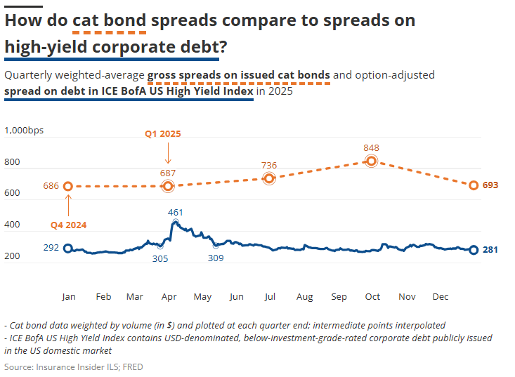 Meanwhile, and by way of comparison, average gross cat bond spreads remain well above those on offer from high-yield corporate bonds.