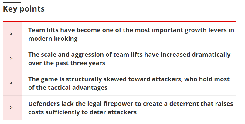 Crucially, this upscaling has raised the stakes for all brokers. What would once have been dismissed as sharp practice is now, in some quarters, simply competitive strategy – and the previous consensus around the ethics of team lifts has fractured along the fault line between attackers and defenders.