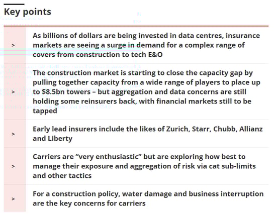With billions being invested in the creation and upscaling of data centres across the world, several lines of business face the prospect of a surge in demand for cover, starting with construction.