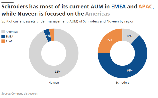 Most of Nuveen’s AuM hails from the Americas (93%), while Schroders’ assets stem from Europe (63%), the UK (25%) and Asia Pacific (12%).