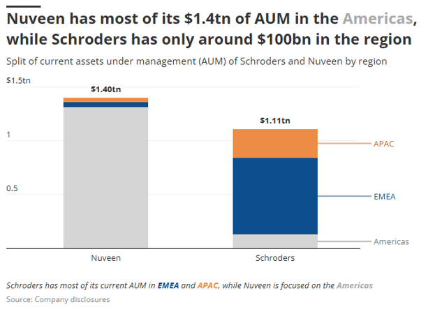 The combined firm will achieve scale of $2.5tn in assets under management (AuM), adding Nuveen’s $1.4tn and Schroders’ $1.1tn.